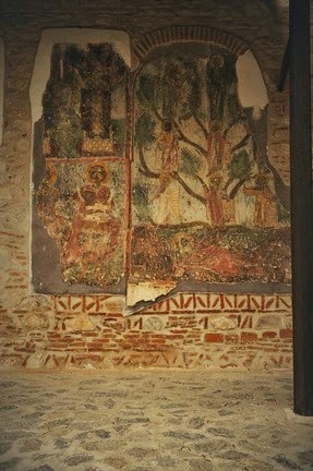 | Η θεματική τοιχογραφία της Παναγίας Μαυριώτισσας. Αρχές 13ου αιώνα.πηγή φωτογρ:fos-kastoria.blogspot.gr |
